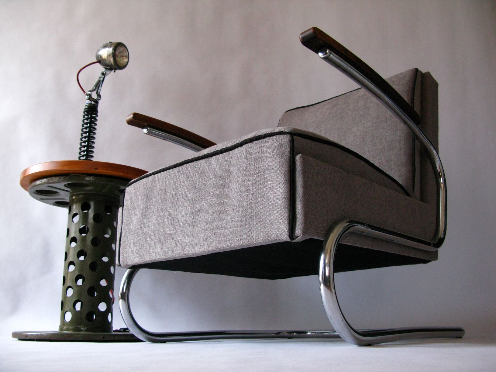 Styl/Období: Bauhaus/Funkcionalismus Rok: 1932 Design: pův.návrh Marcel Breuer/ W. H. Gispen Země:Československo Výrobce: Thonet typ S411, Mücke Melder typ Fn24, později Kovona n.p. Materiál: Chromovaná trubková ocel, područky ohýbaný buk-masiv, klasické čalounění, potahová látka Stav: Originál chrom a původní dřevo vyleštěno, renovace pův. klasického čalounění z tlačných pružin, potah nová kvalitní látka-šedá Rozměry: šířka:61cm, hloubka:70cm, výška:80cm, výška sedu:40cm, výška područek:58cm K dispozici SET (2 kusů) křesel v původním stavu, originál chrom vyleštěn, dřevěné područky nově lakovány, možnost výběru čalounění látka, nebo kůže.